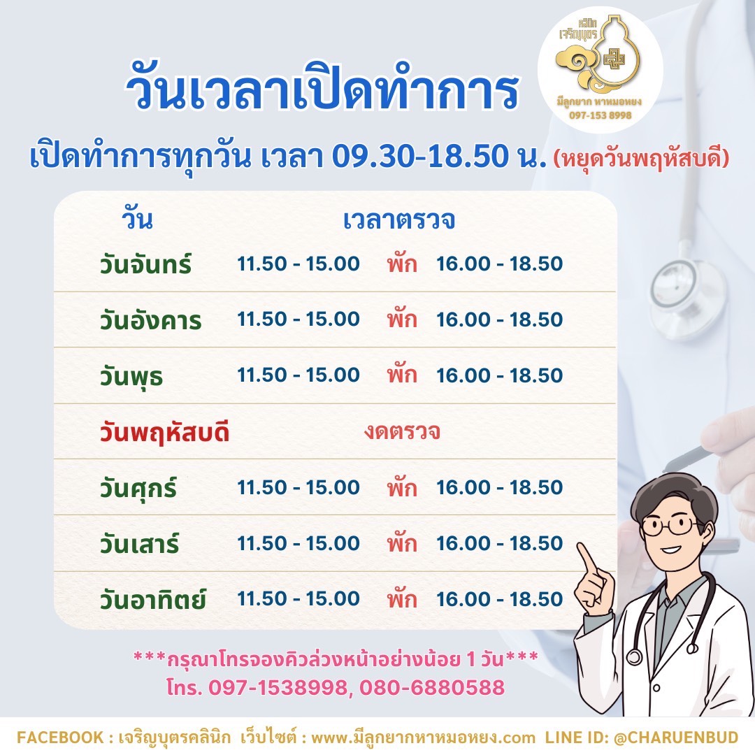 เจริญบุตรคลินิก ให้บริการตรวจ-รักษา ภาวะมีบุตรยาก มีลูกยาก ภูมิแพ้ ไมเกรน อาการปวด และชาตามตำแหน่งต่างๆ อาการปวดประจำเดือน กรดไหลย้อน เบาหวาน การนอนไม่หลับ สาเหตุการเกิดสิว ด้วยสมุนไพรไทย-จีน มีให้เลือกใช้ทั้ง แบบชนิดนำกลับไปต้มเอง แบบแคปซูล และแบบเม็ดลูกกลอน วิธีการตรวจรักษาจะใช้วิธีการตรวจชีพจร หรือที่เรียกว่า “การแมะ” ซึ่งเป็นส่วนประกอบหนึ่งในการวินิจฉัยโรค